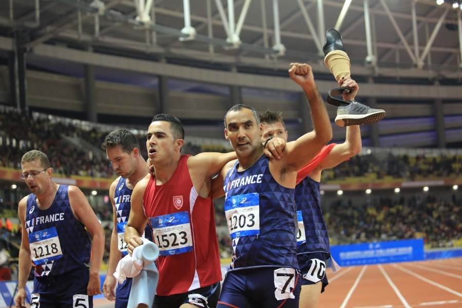 ▲10月25日,武漢五環(huán)體育中心田徑賽場,剛剛完成男子殘疾人1500米項目的各國運動員相互攙扶,離開賽場,彰顯軍運和平精神(攝影:朱西迪)