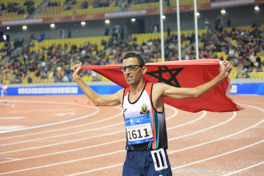 ▲10月25日,武漢五環(huán)體育中心田徑賽場,來自摩洛哥的申圖夫成為本屆軍運會男子殘疾人1500米盲人組唯一的運動員(攝影:朱西迪)