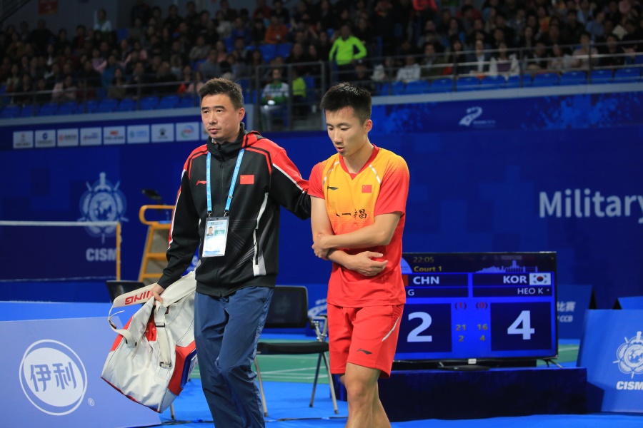 ▲10月26日,武漢大學大學生體育活動中心,羽毛球男子單打決賽,中國選手陸光祖舊傷復發(fā),無奈退賽(攝影:朱西迪)