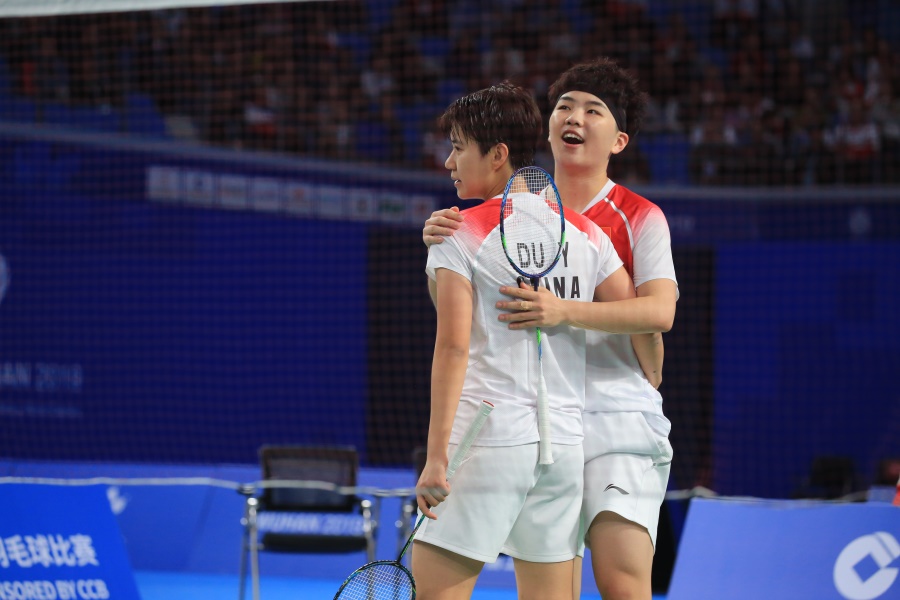 ▲10月26日,武漢大學大學生體育活動中心,羽毛球女雙決賽,中國選手杜玥、李茵暉2:1逆轉戰(zhàn)勝隊友黃東萍、鄭雨(攝影:朱西迪)