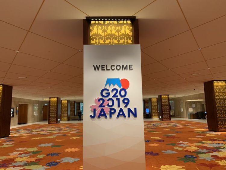 大阪麗嘉皇家酒店內(nèi),帶有二十國集團(tuán)領(lǐng)導(dǎo)人大阪峰會會標(biāo)的迎賓牌格外醒目。新華社記者黃敬文攝