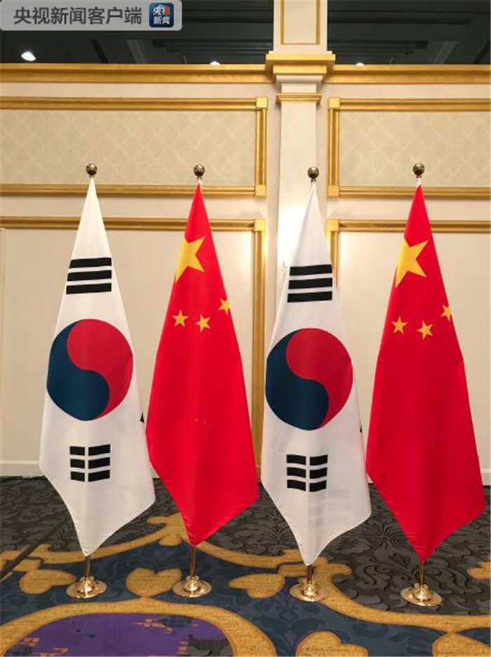 會(huì)見(jiàn)現(xiàn)場(chǎng)的中韓兩國(guó)國(guó)旗(央視記者石偉明拍攝)。