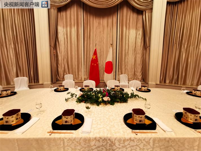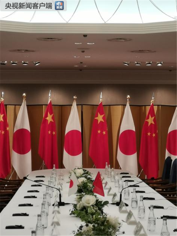 會(huì)見現(xiàn)場(chǎng)的中日兩國(guó)國(guó)旗(央視記者楊立峰拍攝)。