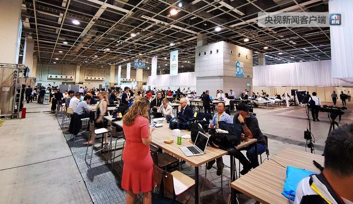 △各國(guó)記者在G20新聞中心密切關(guān)注峰會(huì)進(jìn)展。(央視記者荊偉拍攝)