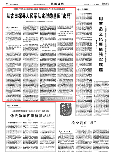 撫今追昔,我軍之所以能夠保持人民軍隊(duì)的性質(zhì)始終不變,就在于中國共產(chǎn)黨人在古田的偉大創(chuàng)造給人民軍隊(duì)注入了生生不息的紅色基因。羅榮桓同志說,古田會議后,“我軍要建立一支什么樣的軍隊(duì),就定型了”。到古田尋覓讓人民軍隊(duì)定型的遺傳“密碼”,很能給我們以深刻啟迪。請關(guān)注今日《解放軍報(bào)》的報(bào)道——