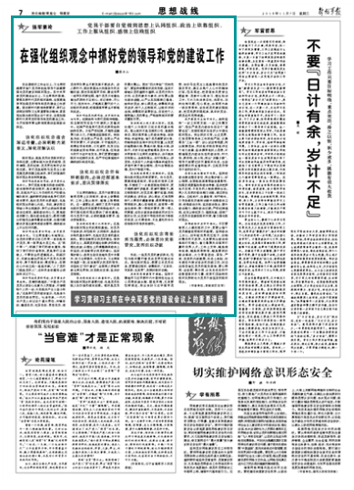 在全國組織工作會議上,習(xí)主席明確要求每個黨員特別是領(lǐng)導(dǎo)干部都要強化黨的意識和組織觀念。在中央軍委黨的建設(shè)會議上,習(xí)主席再次強調(diào),要落實新時代黨的組織路線,全面提高我軍加強黨的領(lǐng)導(dǎo)和黨的建設(shè)工作質(zhì)量。面對新時代新使命新要求,我們必須深刻領(lǐng)悟習(xí)主席重要指示精神,緊緊扭住強化組織觀念這個抓手,全面加強新時代我軍黨的領(lǐng)導(dǎo)和黨的建設(shè)工作,為開創(chuàng)強軍事業(yè)新局面提供堅強政治保證。