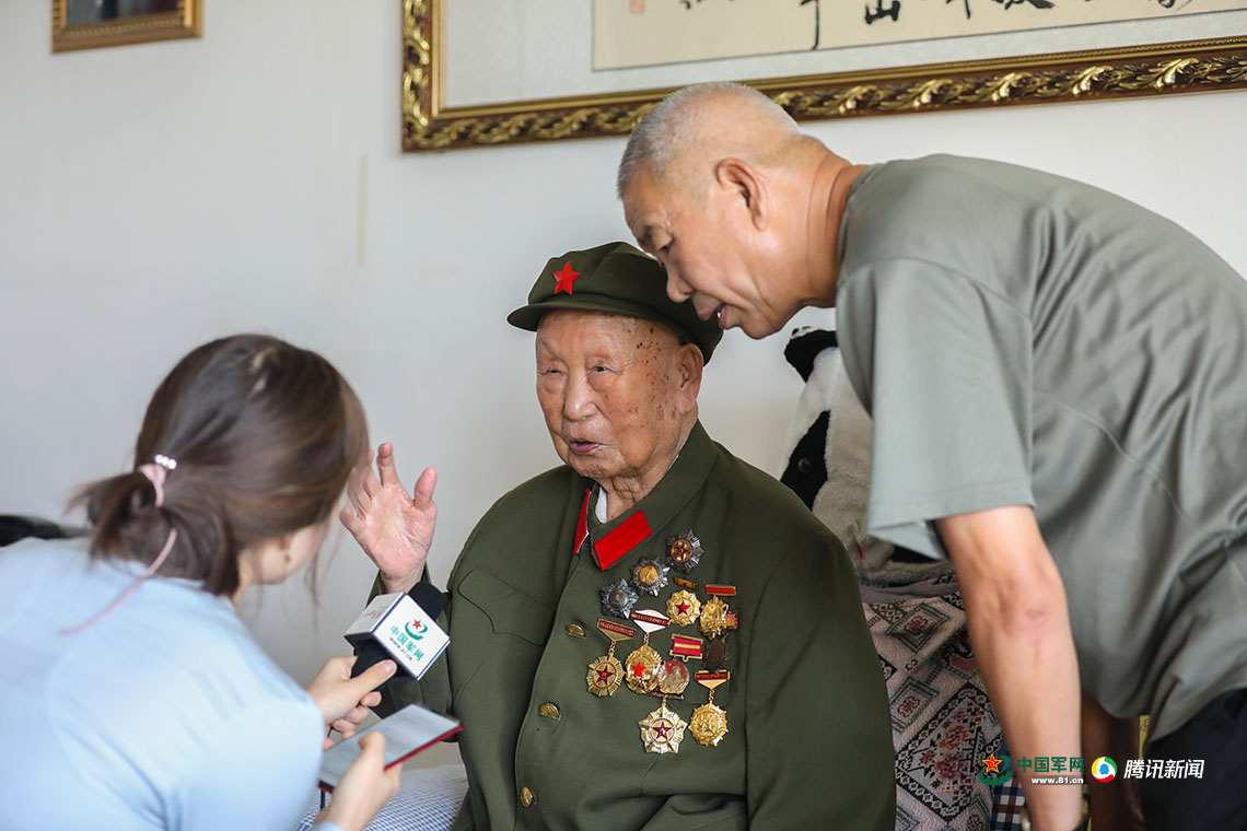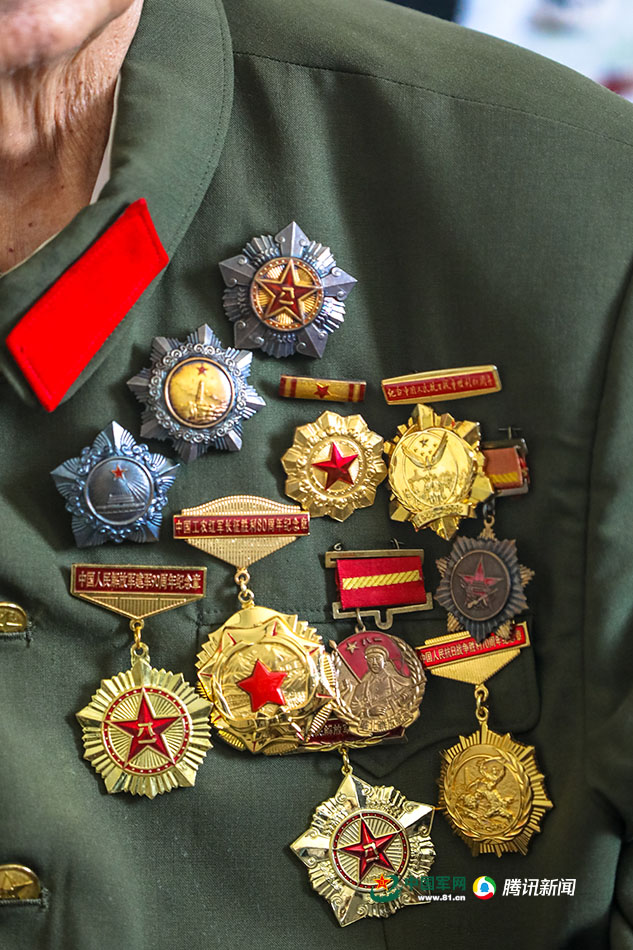 馬志選接受記者采訪時總是會穿上心愛的軍裝,胸前滿滿的軍功章甚是耀眼。中國軍網(wǎng)記者 伍行健 攝
