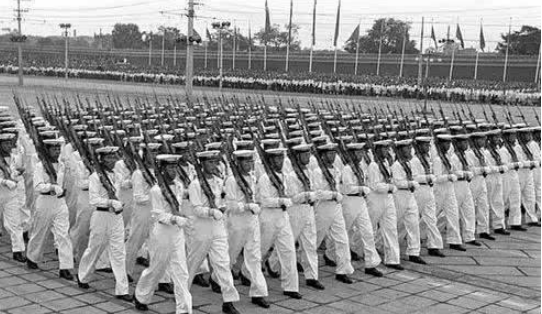 1954年國(guó)慶閱兵式上,步兵在軍樂聲中列隊(duì)經(jīng)過天安門檢閱臺(tái)接受檢閱。