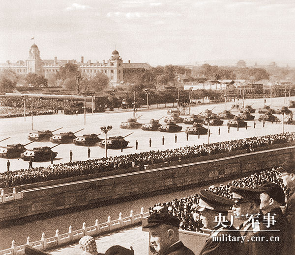 彭德懷元帥在閱兵總指揮楊成武上將的陪同下,乘車檢閱了中國人民解放軍陸海空軍各部隊(duì)。