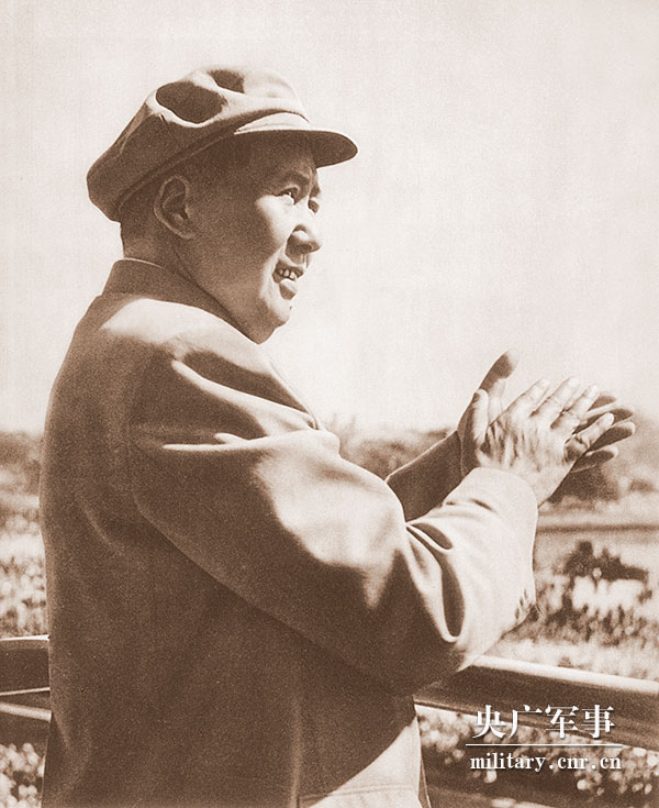 毛澤東主席在天安門城樓上向受閱部隊(duì)和游行群眾鼓掌致意 (侯波攝)