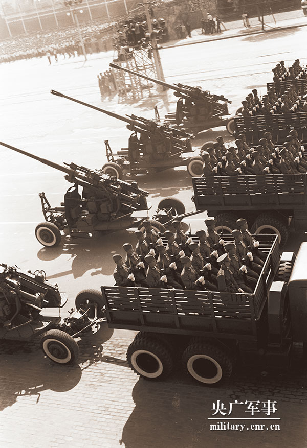 摩托化步兵、傘兵的汽車通過之后,炮兵方隊(duì)過來了。方隊(duì)中有國產(chǎn)的85加農(nóng)炮,122、152國產(chǎn)榴彈炮。緊接著是85高射炮、101高射炮,122加農(nóng)炮,152加農(nóng)榴彈炮。在受閱的炮兵行列里,有來自抗美援朝戰(zhàn)場上的屢立戰(zhàn)功的志愿軍炮手們,有在太原戰(zhàn)役中榮立大功的光榮連隊(duì)。