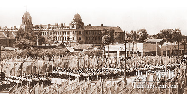 在穿著海藍(lán)色禮服的隊(duì)伍里,還有一位特等戰(zhàn)斗英雄衛(wèi)小堂。這位從前給地主放羊的牧童,現(xiàn)在已成長為中國人民解放軍的大尉。1954年五一勞動(dòng)節(jié),他曾應(yīng)邀參加蘇聯(lián)莫斯科紅場觀禮,他看到蘇聯(lián)軍隊(duì)強(qiáng)大的陣容,非常羨慕。如今,他也走在強(qiáng)大的人民解放軍受閱的行列里,感到非常的自豪。