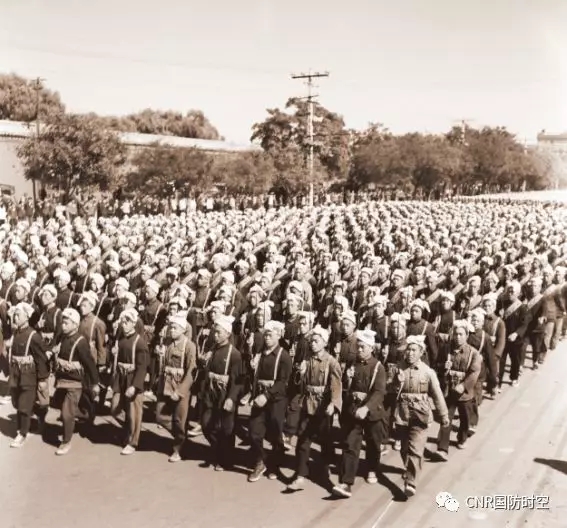 民兵隊伍像人民解放軍一樣,以正方的隊形前進。觀禮臺上響起一陣陣掌聲。“首都民兵師”五個大紅字展現在人們面前。首都7個民兵師排著方隊通過天安門。頭戴柳條帽身穿工作服的是石景山鋼鐵廠和發(fā)電廠的工人民兵師;身穿白色上衣、胸前掛著沖鋒槍的是國棉一、二、三廠的工人民兵;每人背著一臺報話機和卡賓槍的是郵電學院學生民兵方隊……