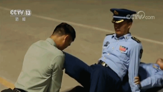 受閱隊員 謝盛陶:教練員就說讓我們在回寢室過后,就自己去壓, 一個人躺在地上,然后一個人坐在他的腳面上,然后他就把相當(dāng)于腰就彎下去,這樣就不斷去壓把腳尖壓平,這樣踢出正步更好看。