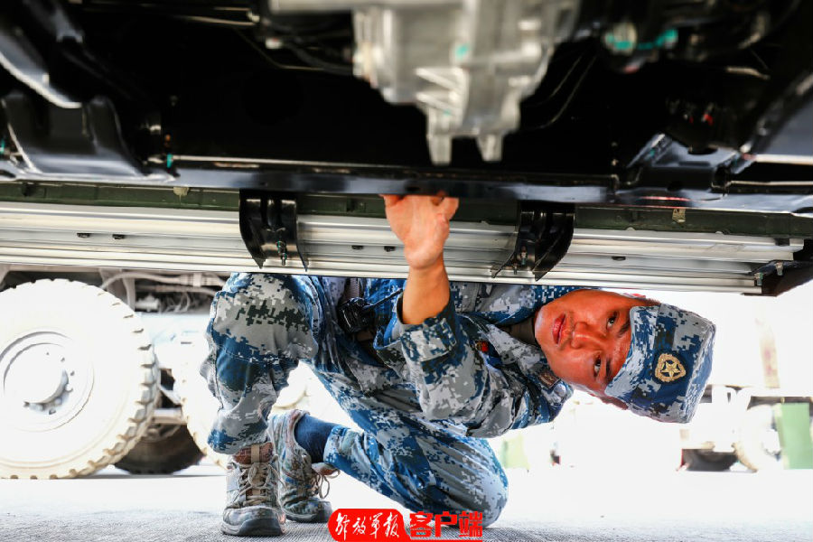 訓(xùn)練間隙檢查車底盤情況(王軼哲 攝)