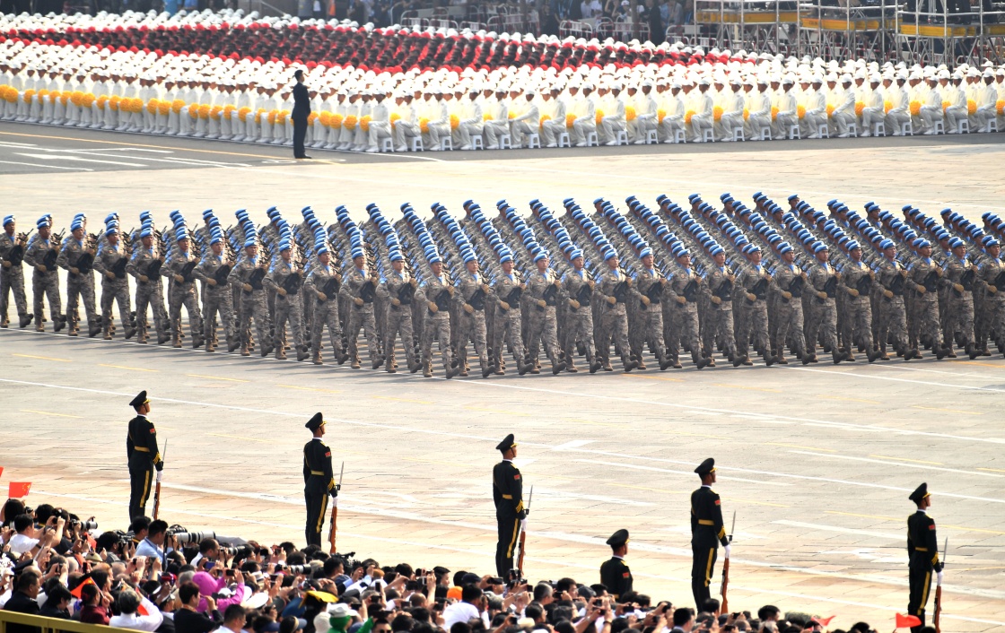 10月1日上午,慶祝中華人民共和國成立70周年大會在北京天安門廣場隆重舉行。這是維和部隊方隊接受檢閱。新華社記者 殷博古 攝