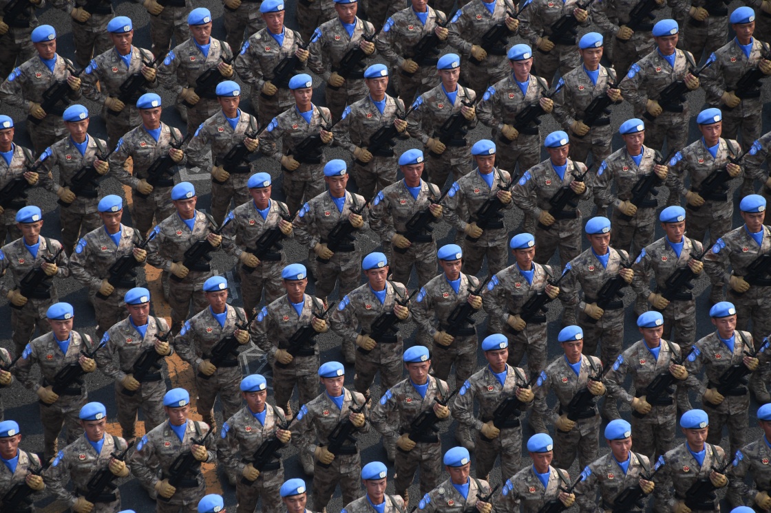 10月1日上午,慶祝中華人民共和國成立70周年大會在北京天安門廣場隆重舉行。這是行進(jìn)中的維和部隊方隊。新華社記者 潘昱龍 攝