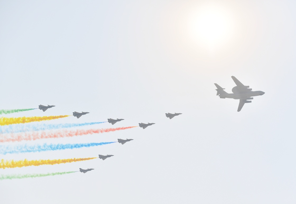在空警-2000預(yù)警機(jī)上擔(dān)任指揮員的是空軍司令員丁來(lái)杭上將。空警-2000預(yù)警機(jī)自2009年國(guó)慶60周年閱兵首次亮相以來(lái),已是第4次接受檢閱。由空軍八一飛行表演隊(duì)駕駛的8架殲-10飛機(jī)組成箭隊(duì)護(hù)衛(wèi)兩翼,拉出紅、黃、藍(lán)、綠4種顏色的7道彩煙為后續(xù)梯隊(duì)鋪出華麗的航路。