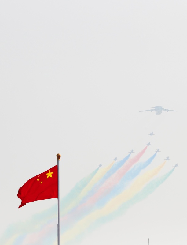 10月1日上午,慶祝中華人民共和國(guó)成立70周年大會(huì)在北京天安門(mén)廣場(chǎng)隆重舉行。這是領(lǐng)隊(duì)機(jī)梯隊(duì)。新華社記者 潘思危 攝