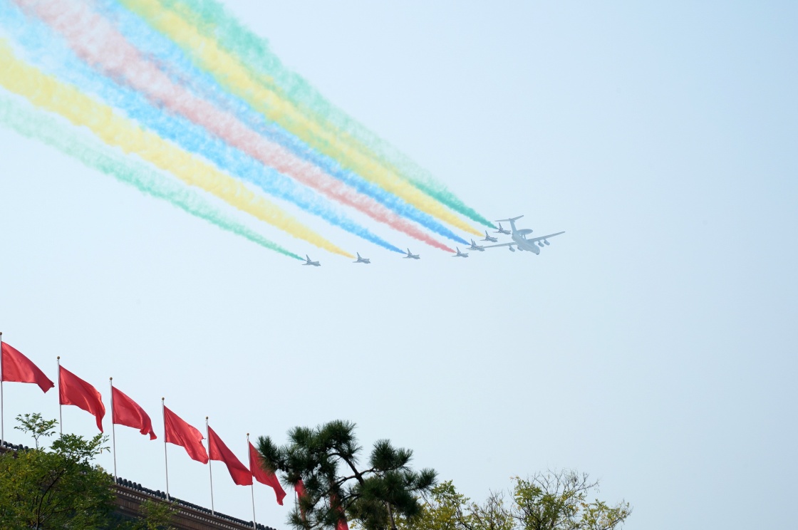 10月1日上午,慶祝中華人民共和國成立70周年大會(huì)在北京天安門廣場隆重舉行。這是領(lǐng)隊(duì)機(jī)梯隊(duì)拉出絢麗的彩煙。新華社記者 李剛 攝