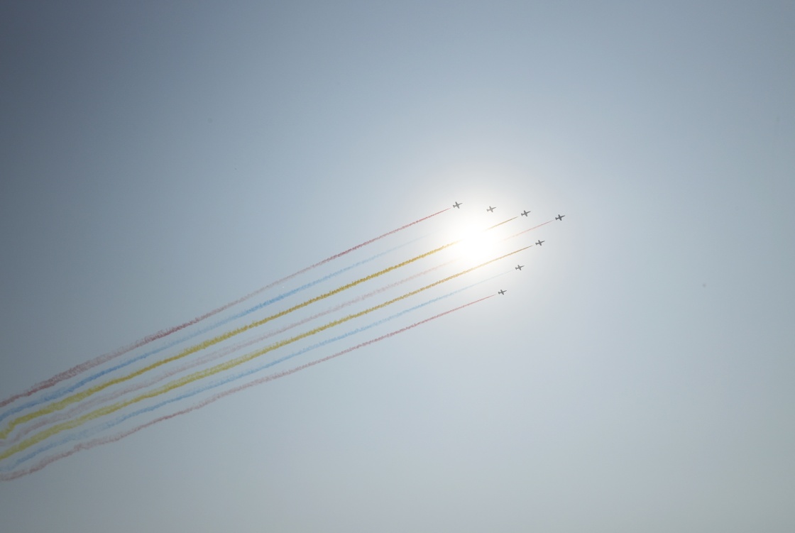 10月1日上午,慶祝中華人民共和國成立70周年大會在北京天安門廣場隆重舉行。這是受閱的教練機(jī)梯隊。新華社記者 沈伯韓 攝