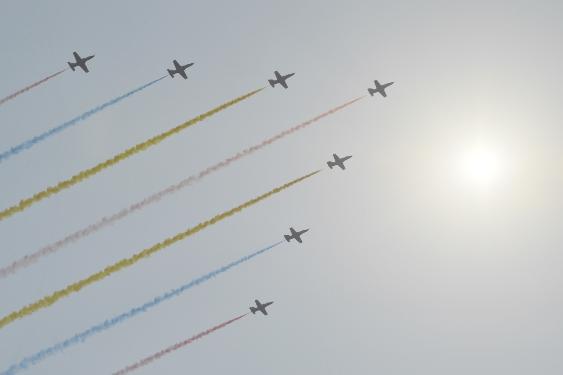 10月1日上午,慶祝中華人民共和國成立70周年大會在北京天安門廣場隆重舉行。這是受閱的教練機(jī)梯隊。新華社記者 許暢 攝