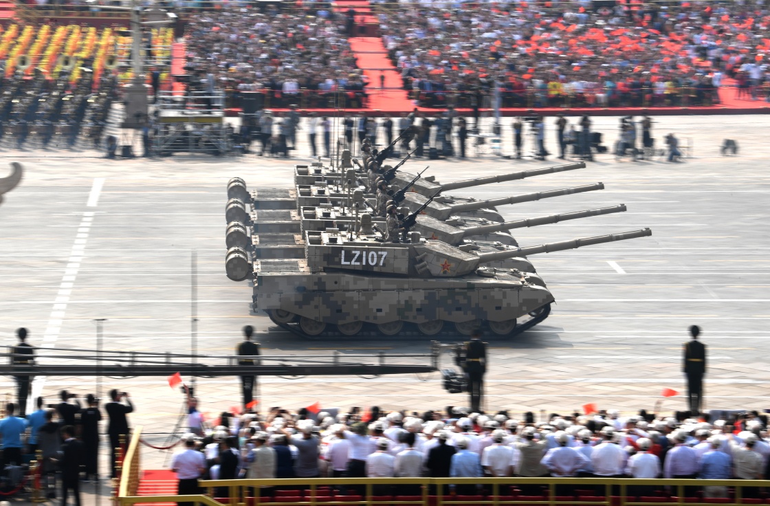 10月1日上午,慶祝中華人民共和國成立70周年大會在北京天安門廣場隆重舉行。這是坦克方隊接受檢閱。新華社記者 殷博古 攝