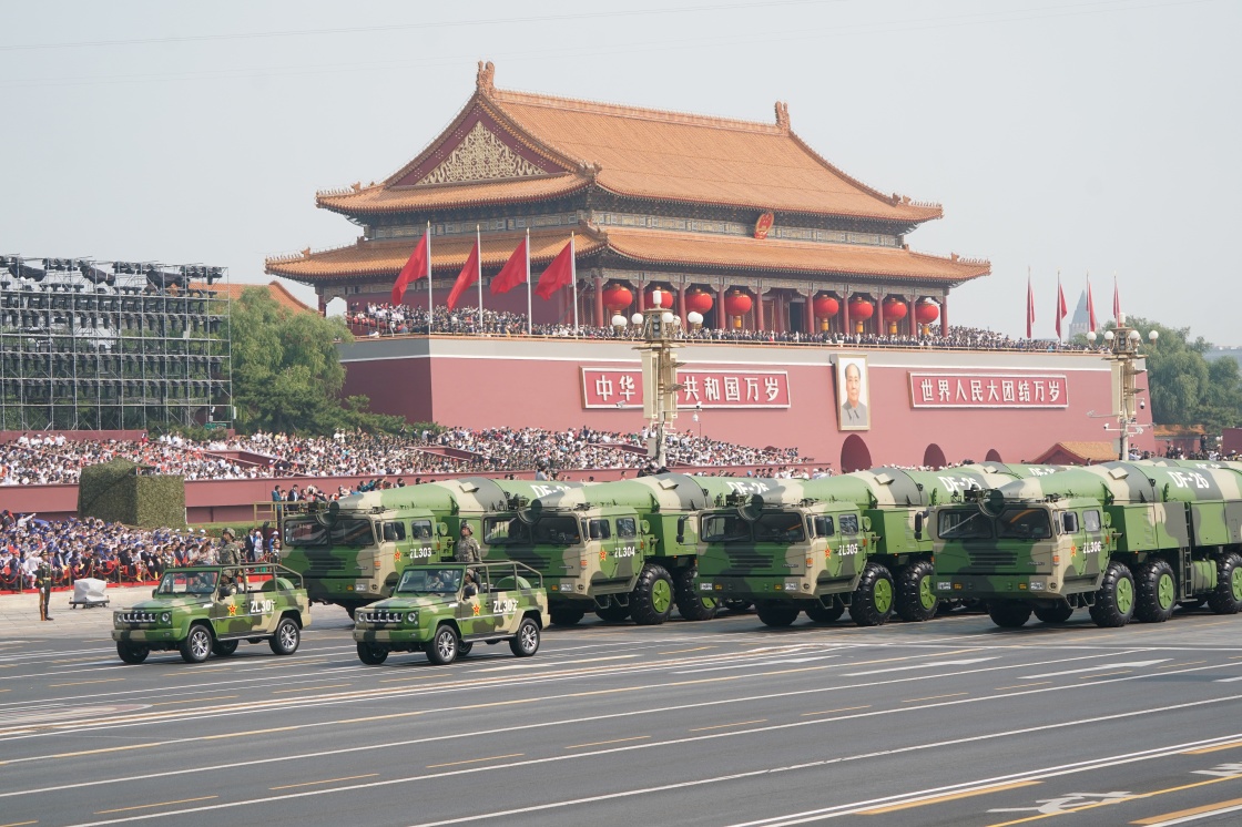 這是東風(fēng)-26核常兼?zhèn)鋵?dǎo)彈方隊。新華社記者 程敏 攝