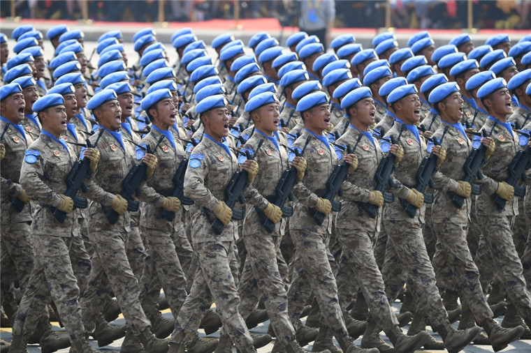 頭戴藍(lán)色貝雷帽、胸佩藍(lán)色絲巾的維和部隊(duì)方隊(duì),作為最后一支徒步方隊(duì)經(jīng)過天安門,首次在國慶閱兵中接受檢閱。