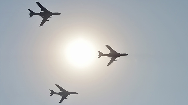 3架轟-6N、6架轟-6K組成的轟炸機(jī)梯隊(duì),1日上午分為3個(gè)3機(jī)楔隊(duì)呼嘯而來(lái)。軍事