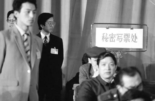 1988年4月,七屆全國(guó)人大一次會(huì)議第六次全體會(huì)議,投票選舉國(guó)家機(jī)構(gòu)領(lǐng)導(dǎo)人。圖為首次設(shè)立的秘密寫票處。(新華社記者李平攝)首次啟用電子表決器