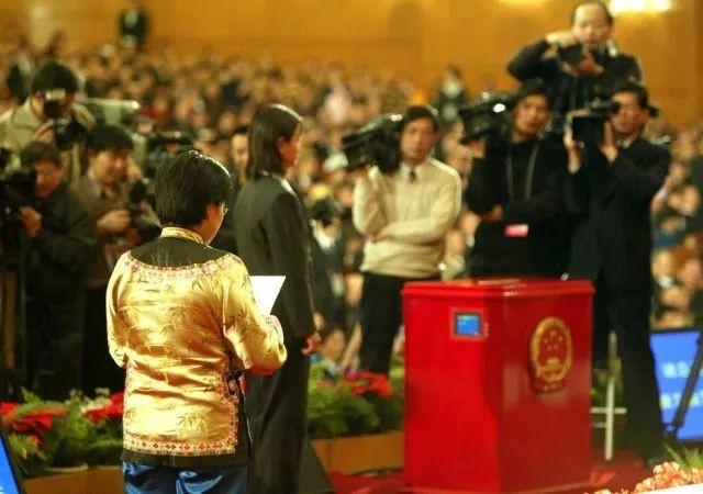 2003年3月,十屆全國(guó)人大一次會(huì)議上,使用智能電子票箱。智能電子票箱能容納1000張選票,能快速讀出各種選舉數(shù)據(jù),再將這些數(shù)據(jù)傳輸?shù)胶笈_(tái)的統(tǒng)計(jì)系統(tǒng)。(新華社記者蘭紅光攝)首次出現(xiàn)農(nóng)民工代表