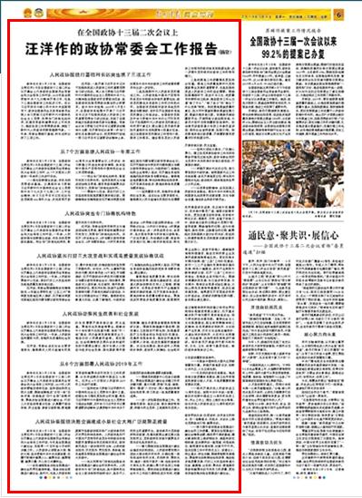 新華社北京3月3日電??全國政協(xié)主席汪洋3日在全國政協(xié)十三屆二次會議開幕會上代表政協(xié)全國委員會常委會向大會報告工作時說,2019年人民政協(xié)要錨定使命任務,堅持團結和民主兩大主題,圍繞統(tǒng)籌推進“五位一體”總體布局、協(xié)調(diào)推進“四個全面”戰(zhàn)略布局,聚焦決勝全面建成小康社會、打好三大攻堅戰(zhàn)等重點任務,認真履行政治協(xié)商、民主監(jiān)督、參政議政職能,提高建言資政和凝聚共識雙向發(fā)力工作的質(zhì)量,以優(yōu)異成績慶祝新中國成立70周年。汪洋從6個方面對人民政協(xié)2019年工作進行部署。