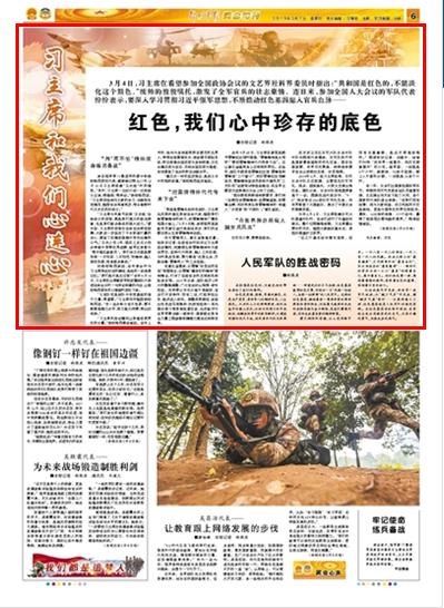 3月4日,習(xí)主席在看望參加全國(guó)政協(xié)會(huì)議的文藝界社科界委員時(shí)指出:“共和國(guó)是紅色的,不能淡化這個(gè)顏色。”統(tǒng)帥的殷殷囑托,激發(fā)了全軍官兵的壯志豪情。連日來,參加全國(guó)人大會(huì)議的軍隊(duì)代表紛紛表示,要深入學(xué)習(xí)貫徹習(xí)近平強(qiáng)軍思想,不斷推動(dòng)紅色基因融入官兵血脈。
