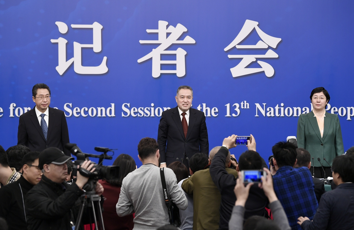 3月11日,十三屆全國人大二次會議新聞中心舉行記者會,邀請國家市場監(jiān)督管理總局局長張茅(中)、國家藥品監(jiān)督管理局局長焦紅(右)、國家知識產(chǎn)權(quán)局局長申長雨(左)就“加強(qiáng)市場監(jiān)管 維護(hù)市場秩序”相關(guān)問題回答中外記者提問。新華社記者 王鵬 攝