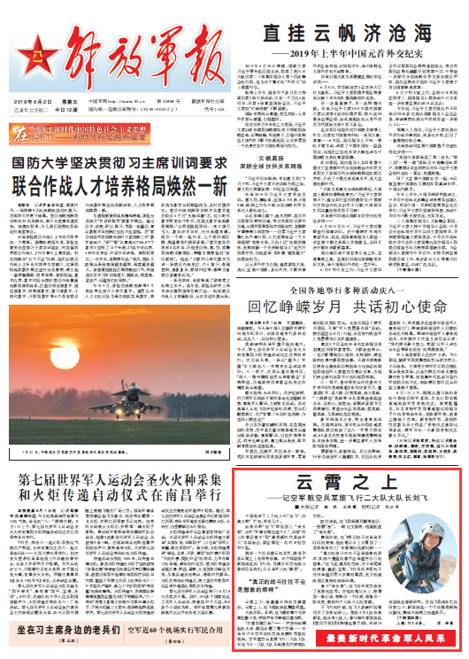 空軍航空兵某旅飛行二大隊大隊長劉飛,擁有一個壯志凌云的名字,擁有許多云霄之上的傳奇故事。這個駕馭國產(chǎn)新型戰(zhàn)機的飛行員,用搏擊長空的戰(zhàn)斗姿態(tài)告訴我們,什么是軍人的“最美”。請關注今日《解放軍報》的報道——