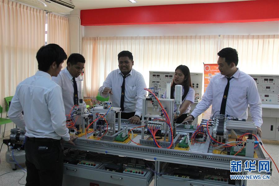 2月20日,在泰國大城技術(shù)學(xué)院內(nèi)的魯班工坊,21歲的泰國人那他武(右三)和同學(xué)們討論學(xué)習(xí)。新華社記者 楊舟 攝