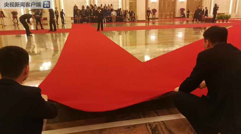 工作人員正在人民大會堂北大廳搭設(shè)兩國元首的檢閱臺。(央視記者張曉鵬拍攝)