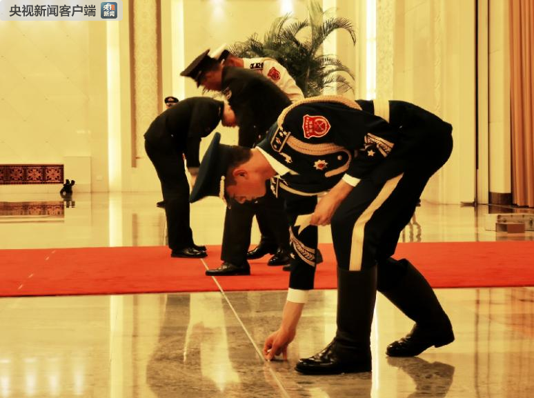 禮兵正在為歡迎儀式貼設(shè)地面標識(央視記者張曉鵬拍攝)