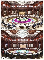 兩年前,首屆“一帶一路”國際合作高峰論壇圓桌峰會,就是在雁棲湖國際會議中心二層集賢廳舉行的。還是這張大圓桌,但這次不同的是,領(lǐng)導(dǎo)人所用座椅比首屆時(shí)窄一些,座椅間距也變小了。原因是,參會領(lǐng)導(dǎo)人從33位增加到40位。