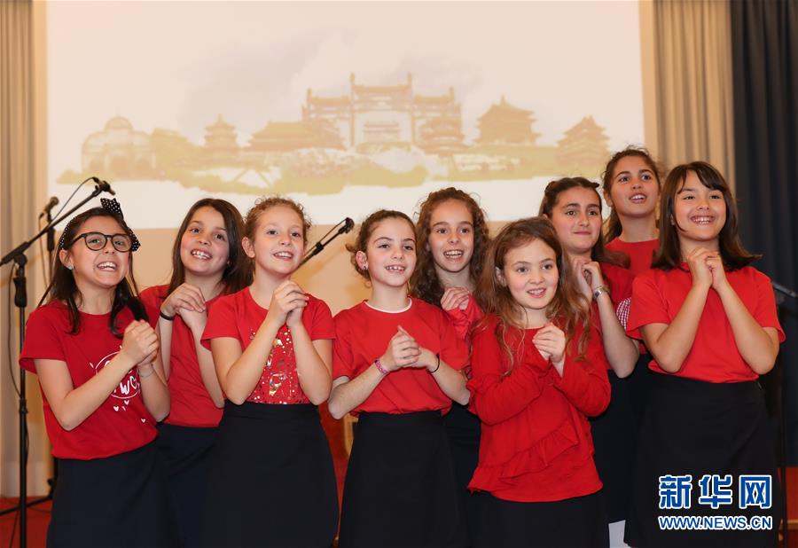 這是2019年2月8日,在意大利拉齊奧的古鎮(zhèn)蒂沃利,蒂沃利國立住讀學校的學生們在中國春節(jié)慶祝活動上給大家拜年。 新華社記者 程婷婷