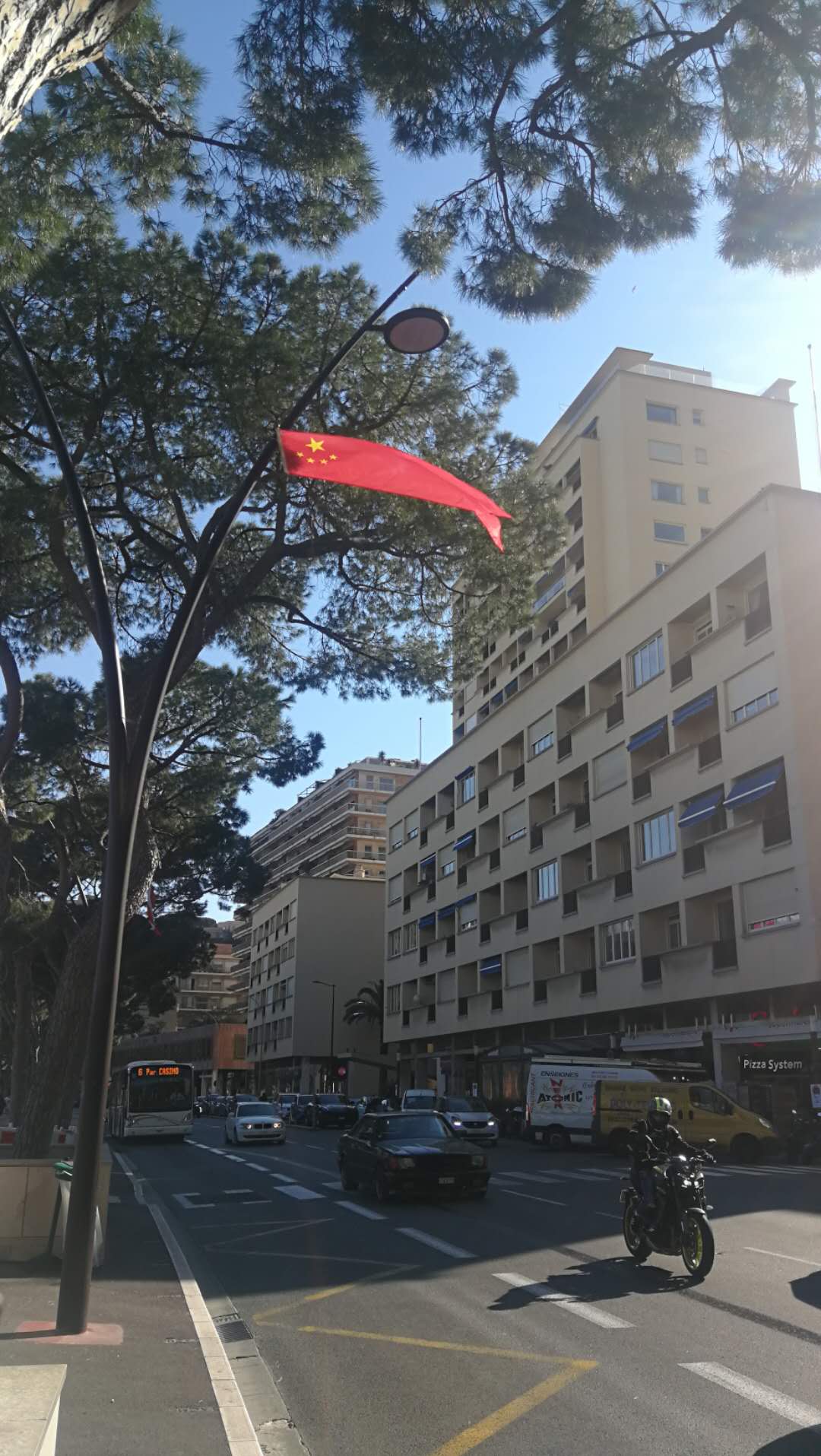△蒙特卡洛賽道上的中國國旗。蒙特卡洛是摩納哥最著名的一個區(qū)。每年五月,狹窄彎曲的街道經(jīng)過約六周的籌備,化身為無數(shù)頂尖車手又愛又恨的“蒙特卡洛賽道”。(央視記者黃京輝拍攝)