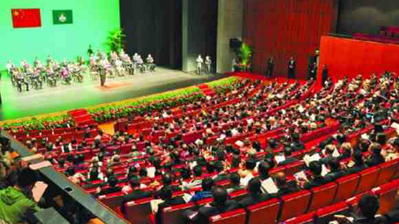 慶祝澳門回歸祖國20周年大會暨澳門特別行政區(qū)第五屆政府就職典禮20日上午在澳門東亞運動會體育館隆重舉行。