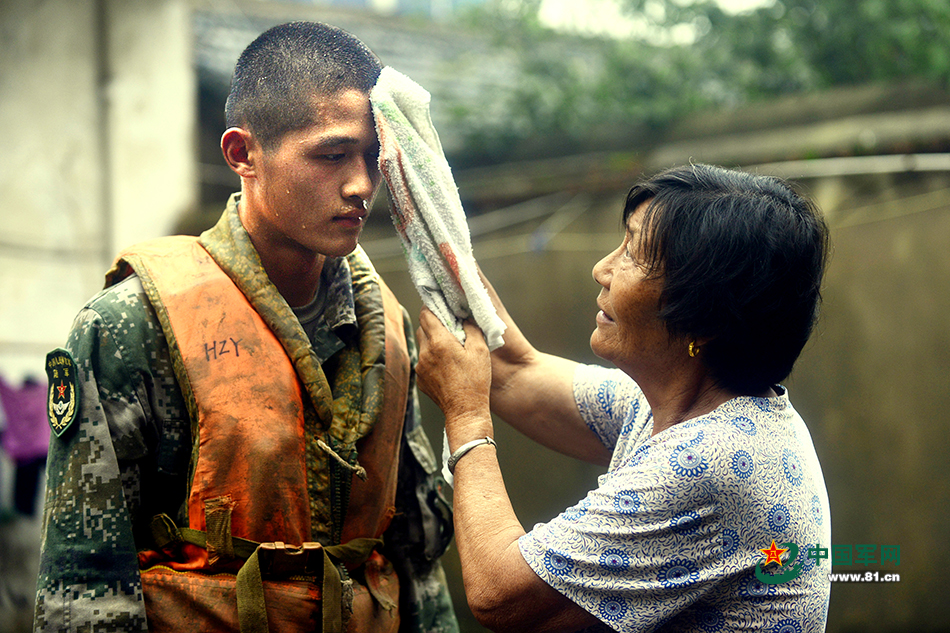 這個(gè)兵叫胡兆洋,是個(gè)列兵,那天是他輾轉(zhuǎn)的第三個(gè)險(xiǎn)情點(diǎn)了,晶橋河芮家圩段。“大家休息下,等待下一個(gè)通知。”泥水中浸泡了3個(gè)小時(shí)的他,身上沾滿了泥,休息的路邊有池清水,便上去洗漱。殊不知,角落里有位老奶奶一直默默地盯著他。清理完,剛轉(zhuǎn)身,老媽媽拿著一條熱毛巾,擁上來給他擦汗。那一刻,他們倆只是一個(gè)眼神,“你和我孫子一樣大”,“換地方了,集合”,來不及說上話,便走了。記者記錄下了這個(gè)瞬間,這里代他向那位不相識(shí)奶奶傳個(gè)話“奶奶,我們都是您的好孫子!”殷永達(dá) 宋志成 謝浩攝影報(bào)道