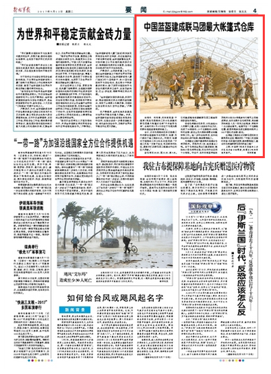 中國(guó)藍(lán)盔建成聯(lián)馬團(tuán)最大帳篷式倉(cāng)庫(kù)