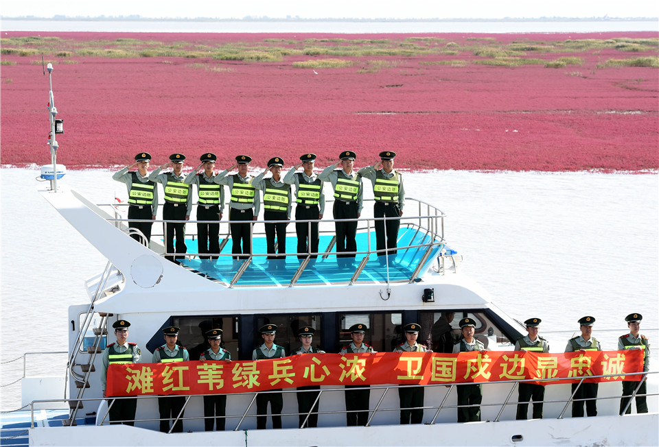 當(dāng)日,遼寧盤(pán)錦公安邊防支隊(duì)官兵以整齊的隊(duì)列,站立在紅海灘濕地前,向祖國(guó)敬禮,祝福生日快樂(lè)。該邊防支隊(duì)從建立之初就堅(jiān)持沿海巡邏,保護(hù)當(dāng)?shù)鬲?dú)特濕地生態(tài)資源。