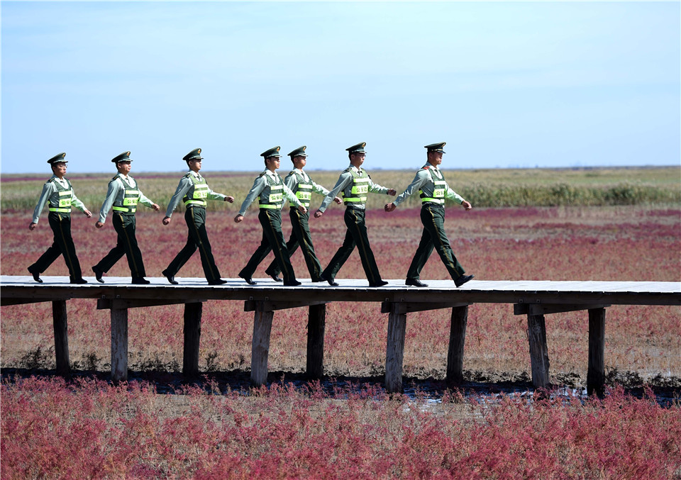 9月27日,遼寧盤錦公安邊防支隊官兵在紅海灘濕地巡邏。新華社記者 李鋼 攝