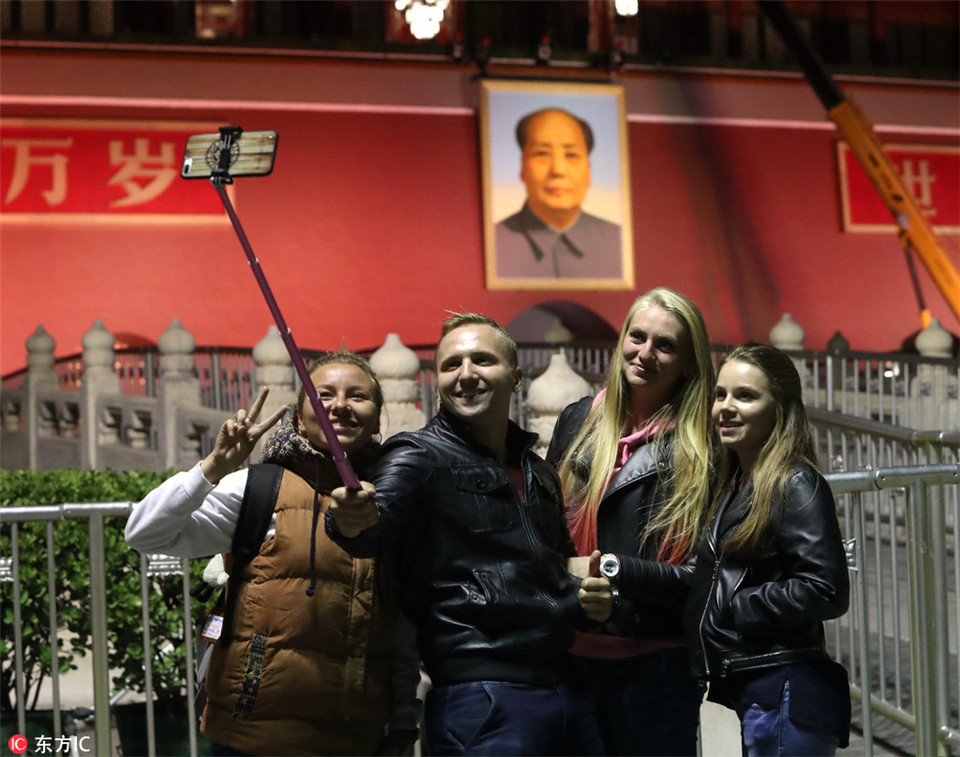 迎國慶天安門城樓更換毛主席畫像 游客與新畫像合影留念