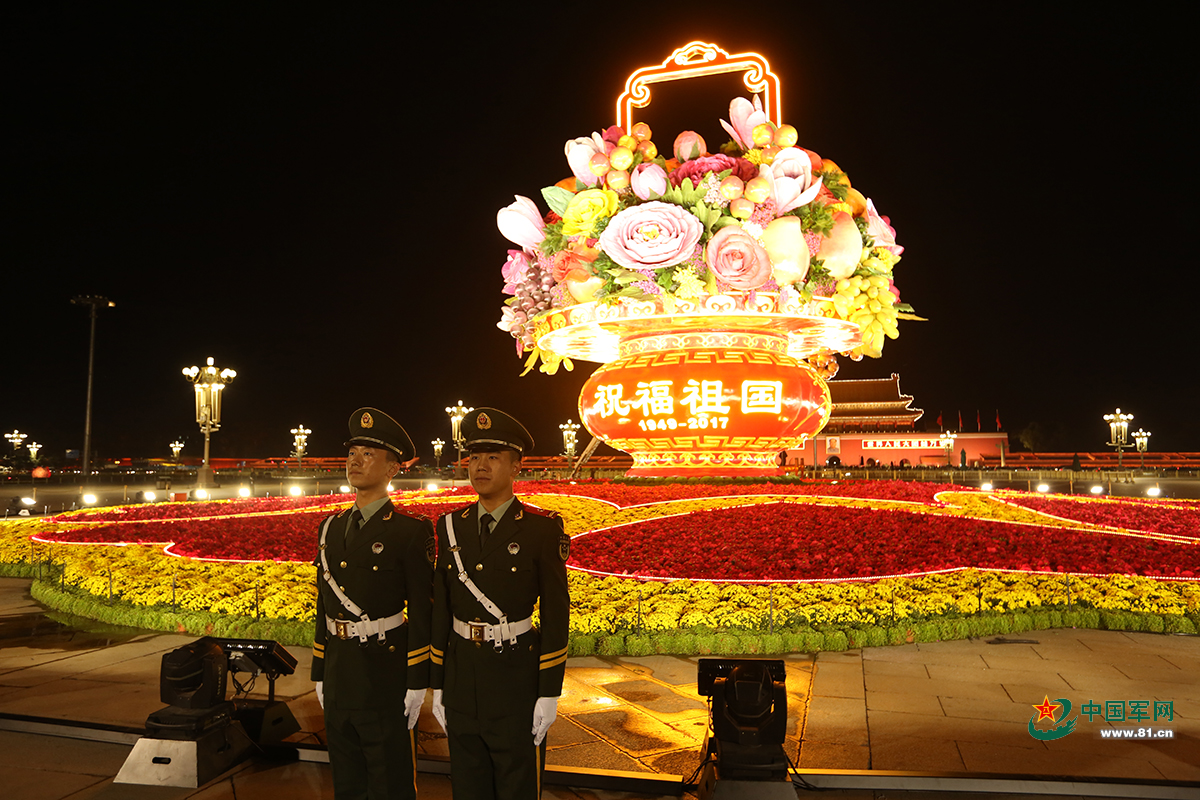 花籃從9月18日開始擺放,到26日凌晨才正式完工。這期間守護(hù)花籃安全任務(wù)的是武警北京總隊(duì)天安門警衛(wèi)支隊(duì)的官兵們。他們?yōu)榱嗽诨ɑ@建設(shè)期間不出差錯(cuò),加強(qiáng)對到花籃搭建現(xiàn)場人員的查驗(yàn)力度。
