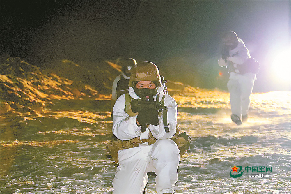 這是北部戰(zhàn)區(qū)陸軍某特戰(zhàn)旅一次帶實(shí)戰(zhàn)背景的冬季戰(zhàn)術(shù)偵察演練。晚上,有淡淡的星光,風(fēng)力3級,溫度降至-25℃。